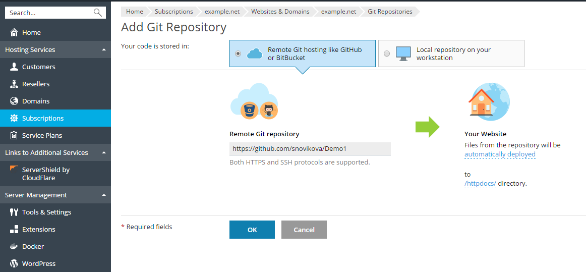 Clique OK. O Plesk tentará se conectar ao repositório remoto e cloná-lo.