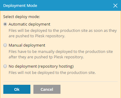 - O modo de implementação Por padrão, a implantação automática é usada. Isso significa que todas as alterações enviadas ao repositório Git serão implantadas automaticamente no site de produção. Se você quiser alterar o modo de implementação, clique no link implantado automaticamente e selecione outra opção na janela aberta do Modo de Implementação. Se a implantação manual estiver selecionada, você precisará implantar manualmente os arquivos do repositório Git em sua hospedagem. Se Nenhuma implantação for selecionada, os arquivos não serão implantados no site de produção (isso pode ser usado, por exemplo, para armazenar e trocar código).