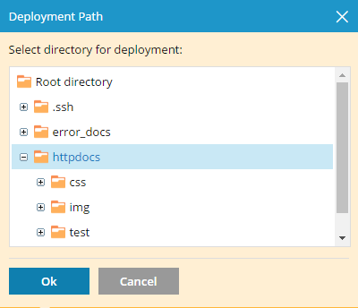 - Um diretório de destino para publicar arquivos Git em seu site. Por padrão, o diretório /httpdocs é usado. Você pode alterá-lo para outro diretório existente clicando no nome do diretório.