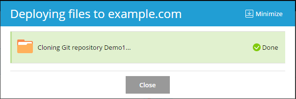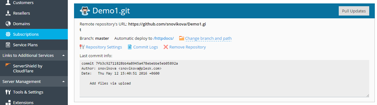 Por padrão, o Plesk usa o modo de implantação automática. Isso significa que, depois que um arquivo é enviado ao repositório, ele é imediatamente implementado no diretório de destino (é possível desativar esse modo, se necessário).