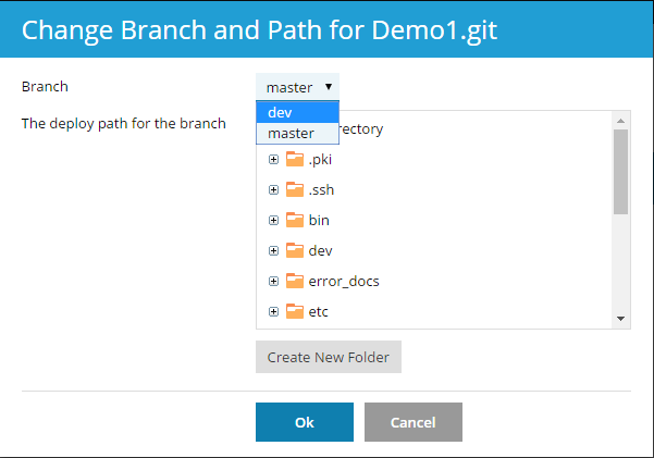 Para adicionar uma nova ramificação, você precisa criá-la no seu repositório remoto e, em seguida, efetuar as alterações. Depois disso, você pode selecionar uma das duas (ou mais) ramificações ativas no Plesk. Vá para