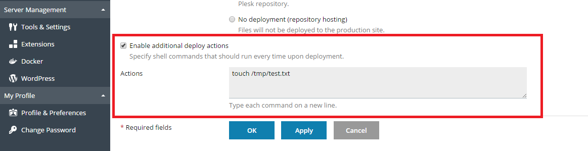 O Plesk oferece a capacidade de definir várias ações adicionais que serão realizadas sempre que os arquivos forem implantados no site.